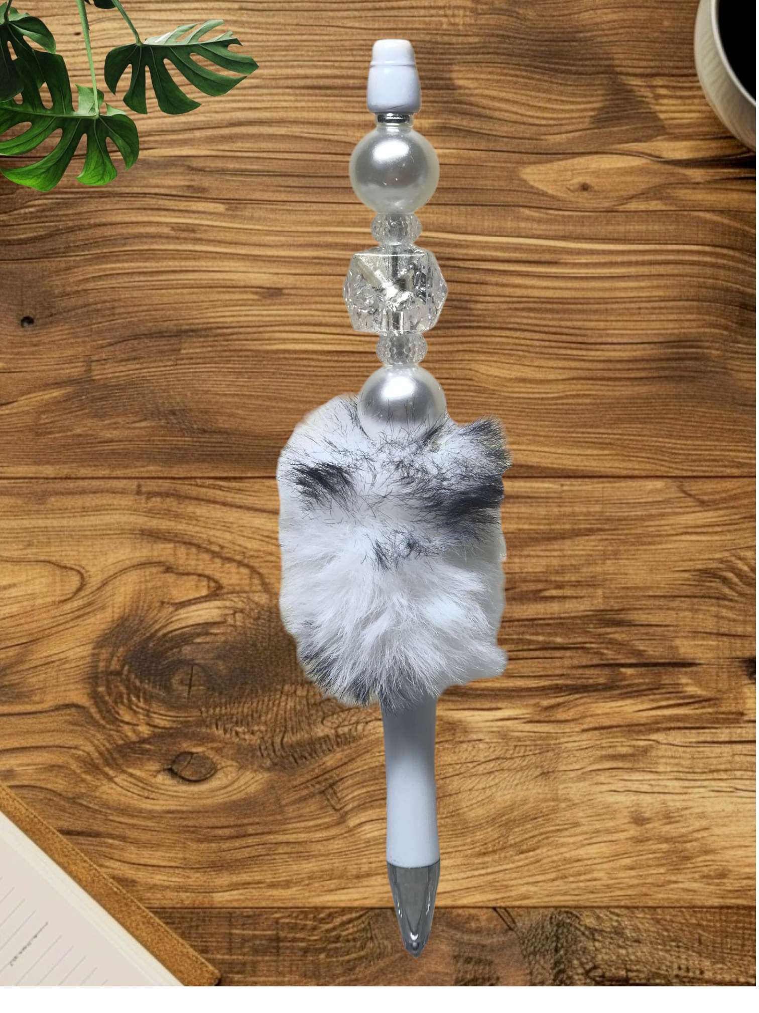 Witte kralenpen met een fluffy pels in zwart-wit, gecombineerd met elegante parelmoer- en transparante kralen.