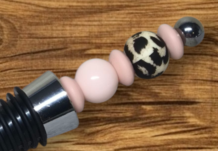 Deze elegante wijnstopper combineert zachtroze kralen met een karaktervolle luipaardkraal.